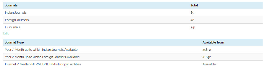 The expanding clinical knowledge and the complexities of health care is a challenge for health care providers. Research, clinical knowledge & skills updating is essential in Health sciences education. To commensurate with current health care and research for our Faculty and students we have subscription to a total of 137 medical journals of which 89 are Indian and 48 are foreign journals.